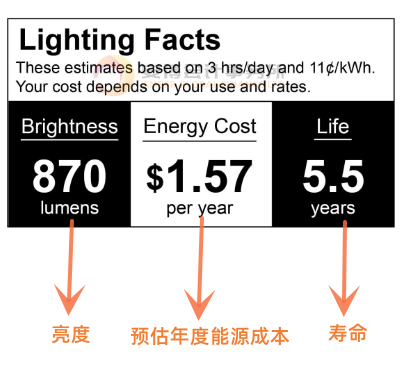 The label includes the lightness, energy consumption, life span, appearance and wattage of the bulb.