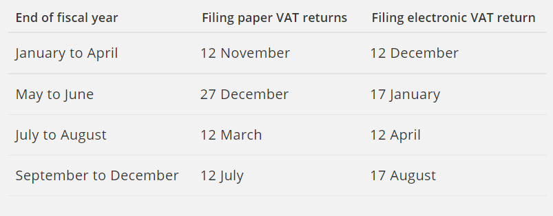 VAT must be filed and paid by the 12th of the second month following the reporting period (except August, when the deadline is 17th).